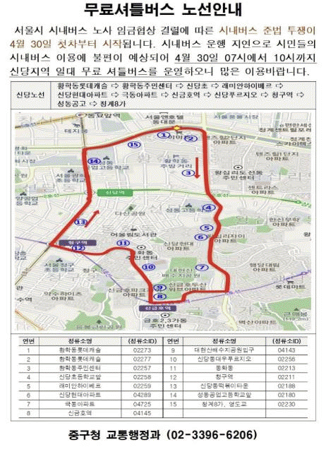 [NWS¹æ¼Û=Çѽ¸ñ ±âÀÚ]¼­¿ï Áß±¸°¡ ¼­¿ï ½Ã³»¹ö½º Àü¸é ÀïÀÇÇàÀ§ ¿¹°í¿¡ µû¸¥ ±¸¹Î ºÒÆíÀ» ÃÖ¼ÒÈ­Çϱâ À§ÇØ ½Ã³»¹ö½º Á¤·ùÀå ¹× ÁöÇÏö¿ªÀ» ¿¬°èÇÏ´Â ¹«·á ¼ÅƲ¹ö½º 2°³ ³ë¼±À» 4¿ù 30ÀÏ Ãâ±Ù½Ã°£´ë¿¡ ¿îÇàÇÑ´Ù. ÀÓ±ÝÇù»óÀÌ ÃÖÁ¾ °á·ÄµÇ¡¦