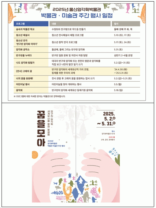 [NWS¹æ¼Û=Çѽ¸ñ ±âÀÚ] ¿ï»ê¾Ï°¢È­¹Ú¹°°üÀº 5¿ù °¡Á¤ÀÇ ´Þ°ú ¡®2025³â ¹Ú¹°°ü?¹Ì¼ú°ü ÁÖ°£¡¯À» ¸Â¾Æ ¿À´Â 5¿ù 2ÀϺÎÅÍ 31ÀϱîÁö ¹®È­Çà»ç ¡®²ÞÀ» ¸ð¾Æ-¹Ý±¸Ãµ ¾Ï°¢È­, ¼¼°èÀ¯»êÀ» ÇâÇÑ ¹ß°ÉÀ½¡¯À» °³ÃÖÇÑ´Ù°í ¹àÇû´Ù. ¡®¹Ú¹ÌÁÖ°£¡¯Àº¡¦
