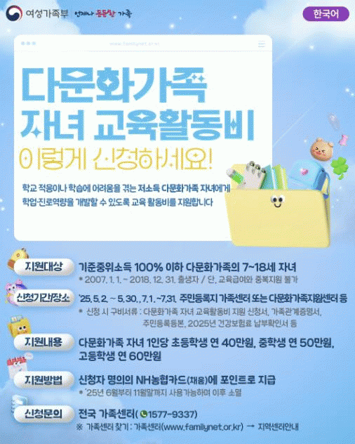 [NWS¹æ¼Û=Çѽ¸ñ ±âÀÚ]½ÃÈï½Ã´Â °ü³» ´Ù¹®È­°¡Á· ÀÚ³àµéÀÇ ±³À° ±âȸ È®´ë¸¦ À§ÇØ ¡®2025³â ´Ù¹®È­°¡Á· ÀÚ³à ±³À°È°µ¿ºñ Áö¿ø»ç¾÷¡¯À» ÃßÁøÇØ ÃÊ¡¤Áß¡¤°íµîÇлýÀ» ´ë»óÀ¸·Î ¿¬ 40¸¸~60¸¸ ¿ø »ó´çÀÇ ±³À°È°µ¿ºñ¸¦ Áö¿øÇÑ´Ù. ´Ù¹®È­°¡Á· ÀÚ¡¦