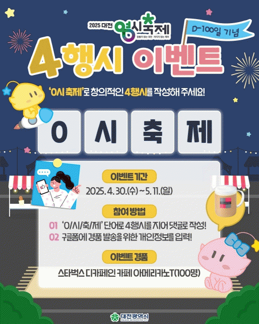[»çȸ] 2025 ´ëÀü 0½Ã ÃàÁ¦, D-100 ±â³ä SNS À̺¥Æ®¡®0½Ã ÃàÁ¦ 4Çà½Ã¡¯ |2025. 04.30