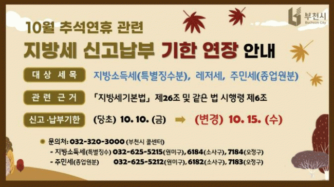 [NWS¹æ¼Û=Çѽ¸ñ ±âÀÚ]ºÎõ½Ã´Â ±ä Ãß¼® ¿¬ÈÞ·Î ÀÎÇØ ½Ã¹ÎµéÀÌ Áö¹æ¼¼¸¦ ±âÇÑ ³»¿¡ ½Å°í¡¤³³ºÎÇÏ´Â µ¥ ºÒÆíÀ» °ÞÀ» °ÍÀ¸·Î ¿¹»óµÊ¿¡ µû¶ó, 10¿ù ³³ºÎ ´ë»óÀÎ Áö¹æ¼¼ 3Á¾ÀÇ ½Å°í¡¤³³ºÎ ±âÇÑÀ» ±âÁ¸ 10ÀÏ¿¡¼­ 15ÀÏ·Î 5ÀÏ ¿¬ÀåÇÑ´Ù°í ¹àÇû´Ù¡¦
