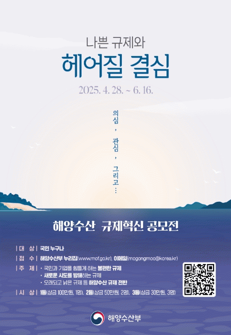 [NWS¹æ¼Û=Çѽ¸ñ ±âÀÚ]ÇØ¾ç¼ö»êºÎ´Â 4¿ù 28ÀϺÎÅÍ 6¿ù 16ÀϱîÁö 50Àϰ£ ÇØ¾ç¼ö»ê ºÐ¾ß ±ÔÁ¦Çõ½Å °úÁ¦¸¦ ¹ß±¼Çϱâ À§ÇÑ ¡®´ë±¹¹Î °ø¸ðÀü¡¯À» °³ÃÖÇÑ´Ù°í ¹àÇû´Ù. ÇØ¾ç¼ö»êºÎ´Â ÇöÀåÀÇ ¸ñ¼Ò¸®¸¦ ¹Ý¿µÇÑ ¼ÒÅë?ü°¨Çü ±ÔÁ¦Çõ½ÅÀ» À§ÇØ 202¡¦