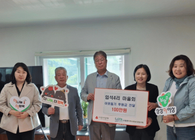 [NWS¹æ¼Û=Çѽ¸ñ ±âÀÚ]³²¾çÁֽô Áö³­ 28ÀÏ, ¼öµ¿¸é ÀÔ¼®4¸® ¸¶À»È¸°¡ ¾î·Á¿î ÀÌ¿ôÀ» À§ÇÑ ÈÄ¿ø±Ý 100¸¸ ¿ø ±âºÎÇß´Ù°í 29ÀÏ ¹àÇû´Ù. ÈÄ¿ø±ÝÀº °æ±â»çȸº¹Áö°øµ¿¸ð±Ýȸ¸¦ ÅëÇØ ¼öµ¿¸é Áö¿ª»çȸº¸ÀåÇùÀÇü¿¡ ÁöÁ¤ ±âʵÆÀ¸¸ç, °ü³» °æÁ¦¡¦