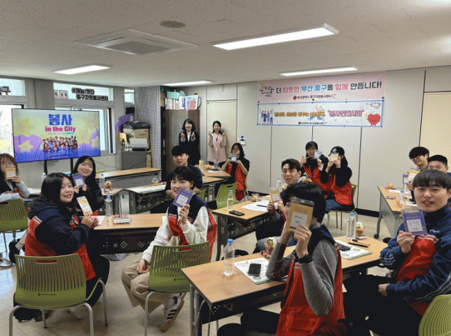 [NWS¹æ¼Û=Çѽ¸ñ ±âÀÚ]ºÎ»ê±¤¿ª½Ã Áß±¸ÀÚ¿øºÀ»ç¼¾ÅÍ´Â 4¿ù 26ÀÏ Áß±¸ÀÚ¿øºÀ»ç¼¾ÅÍ ±³À°½Ç¿¡¼­ û³â ÀÚ¿øºÀ»ç´Ü 'ºÀ»çÀδõ½ÃƼ' 1±â ¹ß´ë½ÄÀ» °³ÃÖÇß´Ù. ºÀ»çÀδõ½ÃƼ´Â û³âµéÀÌ ÀÚ¿øºÀ»ç¸¦ ÅëÇØ »çȸ¹®Á¦¿¡ ÁÖüÀûÀ¸·Î Âü¿©Çϰí, Àڱ⠡¦