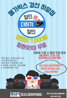 [NWS¹æ¼Û=Çѽ¸ñ ±âÀÚ]°æ»ê½Ã û¼Ò³âÂü¿©À§¿øÈ¸´Â 29ÀÏ CGV °æ»êÁ¡, ¸Þ°¡¹Ú½º °æ»êÇϾçÁ¡°ú ÇÔ²² °æ»ê½Ã û¼Ò³âµéÀÇ ¿µÈ­ °ü¶÷ ±âȸ¸¦ ³ÐÈ÷°í, °ÇÀüÇÑ ¿©°¡È°µ¿À» Áö¿øÇϱâ À§ÇØ Çù¾à(MOU)À» ü°áÇß´Ù. À̹ø Çù¾àÀº û¼Ò³âÂü¿©À§¿øÈ¸°¡ ¡¦