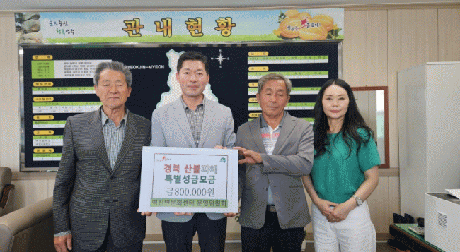 [NWS¹æ¼Û=Çѽ¸ñ ±âÀÚ]º®Áø¸é¹®È­¼¾ÅÍ ¿î¿µÀ§¿øÈ¸´Â Áö³­ 24ÀÏ º®Áø¸é»ç¹«¼Ò¸¦ ¹æ¹®ÇÏ¿© °æºÏ Áö¿ª »êºÒ ÇÇÇØ º¹±¸¸¦ À§ÇÑ ¼º±Ý 80¸¸¿øÀ» Àü´ÞÇß´Ù. º®Áø¸é¹®È­¼¾ÅÍ´Â 2015³â °³°üµÈ ÀÌ·¡·Î Áö¿ªÁֹεéÀÇ ¿©°¡ ¹× ¹®È­»ýȰÀ» À§ÇÑ Çコ¡¦