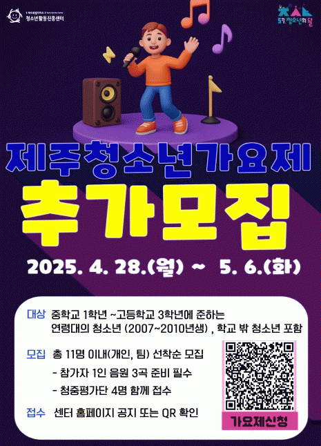 [»çȸ] Á¦ÁÖÆ¯º°ÀÚÄ¡µµÃ»¼Ò³âȰµ¿ÁøÈï¼¾ÅÍ 2025³â 5¿ù û¼Ò³âÀÇ ´Þ ±â³äÇà»ç ¡®Á¦ÁÖ Ã»¼Ò³â °¡¿äÁ¦¡¯Âü°¡ÀÚ Ãß°¡ ¸ðÁý |2025. 04.29