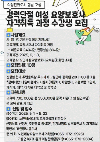 [NWS¹æ¼Û=Çѽ¸ñ ±âÀÚ]°í¼º±ºÀº °æ·Â´ÜÀý ¿©¼ºÀÇ ÀçÃë¾÷À» Áö¿øÇϰí Àü¹® ÀηÂÀ» ¾ç¼ºÇϱâ À§ÇØ ¡®¿ä¾çº¸È£»ç ÀÚ°ÝÃëµæ °úÁ¤¡¯ ¼ö°­»ýÀ» ¸ðÁýÇÑ´Ù. ±³À°Àº 6¿ùºÎÅÍ 8¿ù±îÁö 3°³¿ù µ¿¾È ÁøÇàµÇ¸ç, ¸ðÁýÀοøÀº ¼±Âø¼ø 10¸íÀÌ´Ù. ½Åû ´ë¡¦