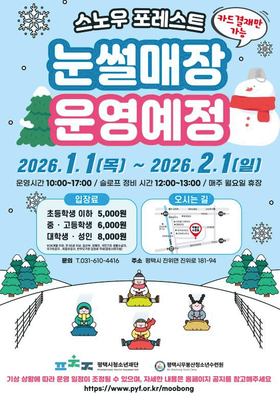 [NWS¹æ¼Û=Çѽ¸ñ ±âÀÚ](Àç)ÆòÅýÃû¼Ò³âÀç´Ü ¹«ºÀ»êû¼Ò³â¼ö·Ã¿øÀº ´«½ä¸ÅÀå ¡®½º³ë¿ì Æ÷·¹½ºÆ®¡¯¸¦ ¿À´Â 2026³â 1¿ù 1ÀϺÎÅÍ 2¿ù 1ÀϱîÁö ¿î¿µÇÒ ¿¹Á¤À̶ó°í ¹àÇû´Ù. ¿Ã°Ü¿ï Áö¼ÓµÈ ±â¿Â »ó½Â µî ±â»ó ¿©°ÇÀ¸·Î ÀÎÇÏ¿© ±âÁ¸ 2025³â 12¿ù¡¦