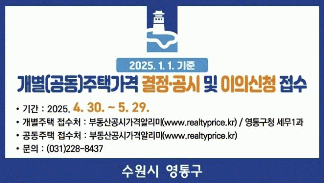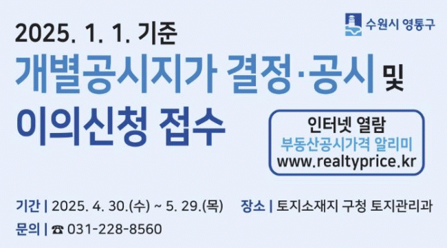 [»çȸ] ¼ö¿ø½Ã ¿µÅ뱸, 2025. 1. 1. ±âÁØ °³º°°ø½ÃÁö°¡ °áÁ¤¡¤°ø½Ã ¹× ÀÌÀǽÅû Á¢¼ö ½ÃÀÛ |2025. 04.29