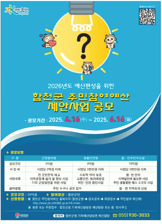 [NWS¹æ¼Û=Çѽ¸ñ ±âÀÚ] ÇÕõ±º(±º¼ö ±èÀ±Ã¶)Àº 2026³âµµ ¿¹»êÆí¼ºÀ» À§ÇÑ ÁÖ¹ÎÂü¿©¿¹»ê Á¦¾È»ç¾÷ °ø¸ð¸¦ 6¿ù 16ÀÏ ±îÁö ½Ç½Ã ÇÑ´Ù°í ¹àÇû´Ù. À̹ø Á¦¾È»ç¾÷ °ø¸ð´Â 20¾ï¿ø ±Ô¸ð·Î, ºÐ¾ßº°·Î ¡â±ºÁ¤ ¹ßÀü¿¡ ±â¿©Çϰí Áö¿ª °øµ¿Ã¼ »îÀÇ Áú¡¦