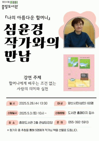 [NWS¹æ¼Û=Çѽ¸ñ ±âÀÚ]¾ç»ê½Ã¸³ Áß¾Óµµ¼­°ü¿¡¼­´Â °¡Á¤ÀÇ ´ÞÀ» ¸ÂÀÌÇÏ¿© Ưº°ÇÑ ¹®ÇÐ Çà»ç¸¦ ¸¶·ÃÇß´Ù. ¿À´Â 5¿ù 28ÀÏ ¿ÀÈÄ 1½Ã 30ºÐºÎÅÍ'³ªÀÇ ¾Æ¸§´Ù¿î ÇÒ¸Ó´Ï'ÀúÀÚ ½ÉÀ±°æ ÀÛ°¡¸¦ ÃÊÃ»ÇØ¡®ÀÛ°¡¿ÍÀÇ ¸¸³²¡¯Çà»ç¸¦ ¿î¿µÇÑ´Ù. '³ªÀÇ ¾Æ¸§¡¦
