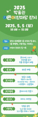 [NWS¹æ¼Û=Çѽ¸ñ ±âÀÚ]¾ç»ê½Ã¸³¹Ú¹°°üÀº 5¿ù 5ÀÏ ¾î¸°À̳¯À» ¸ÂÀÌÇÏ¿© ¹Ú¹°°ü ÀÏ¿ø¿¡¼­¡®2025³â ¾î¸°À̳¯ ÇѸ¶´ç ÀÜÄ¡¡¯¸¦ °³ÃÖÇÑ´Ù. À̹ø Çà»ç´Â ¿Â °¡Á·ÀÌ ÇÔ²² Áñ±æ ¼ö Àִ üÇè°ú °ø¿¬À¸·Î ²Ù¸ì´Ù. ¸ÕÀú dz¼±¾ÆÆ® ³ª´©±â, ºñ´°¹æ¡¦