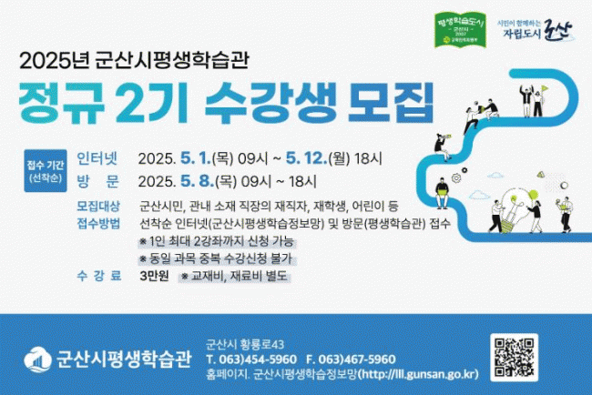 [NWS¹æ¼Û=Çѽ¸ñ ±âÀÚ]Æò»ýÀÇ ¹è¿ò°ú ¼ºÀåÀ» Áö¿øÇϸç Áö¿ª Æò»ýÇнÀÀÇ Á᫐ ¿ªÇÒÀ» ÇÏ´Â ±º»ê½ÃÆò»ýÇнÀ°ü¿¡¼­ ¡®2025³â Á¤±Ô 2±â ÇÁ·Î±×·¥¡¯ ¼ö°­»ýÀ» ¸ðÁýÇÑ´Ù. ¼ö°­ ½ÅûÀº 5¿ù 1ÀÏ ¿ÀÀü 9½ÃºÎÅÍ 5¿ù 12ÀÏ ¿ÀÈÄ 6½Ã±îÁö ±º»ê½ÃÆò»ýÇС¦