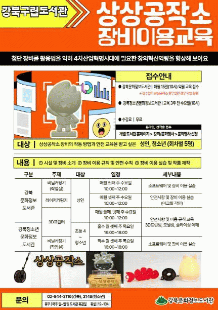 [NWS¹æ¼Û=Çѽ¸ñ ±âÀÚ]°­ºÏ¹®È­Á¤º¸µµ¼­°ü°ú °­ºÏû¼Ò³â¹®È­Á¤º¸µµ¼­°ü¿¡ ¸¶·ÃµÈ »ó»ó°øÀÛ¼Ò°¡ ¿À´Â 5¿ùºÎÅÍ Áö¿ª ÁֹεéÀÇ Ã¢ÀÇÀû ¿ª·® °­È­¿Í µðÁöÅÐ ±â¼ú Á¢±Ù¼º Çâ»óÀ» ¸ñÇ¥·Î ¡®»ó»ó°øÀÛ¼Ò ÀåºñÀ̿뱳À°¡¯À» ¹«·á·Î ¿î¿µÇÑ´Ù. »ó»ó¡¦
