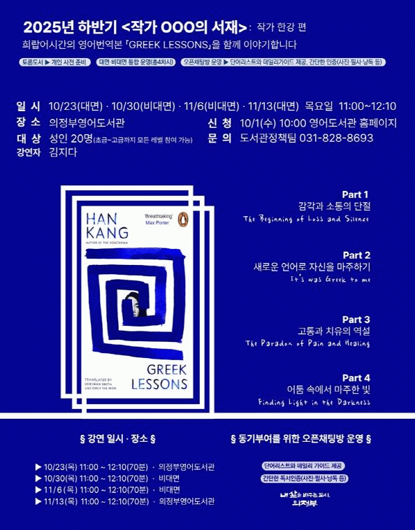 [NWS¹æ¼Û=Çѽ¸ñ ±âÀÚ]ÀÇÁ¤ºÎ½Ã µµ¼­°üÀº 2025³â ÇϹݱ⠡®ÀÛ°¡ OOOÀÇ ¼­Àç: ÇѰ­ Æí¡¯À» 10¿ù ¸ÅÁÖ ¸ñ¿äÀÏ(23ÀÏ, 30ÀÏ, 11¿ù 6ÀÏ, 11¿ù 13ÀÏ) ÃÑ 4ȸ¿¡ °ÉÃÄ ÀÇÁ¤ºÎ¿µ¾îµµ¼­°ü¿¡¼­ ¿î¿µÇÑ´Ù. ÀÛ°¡ OOOÀÇ ¼­Àç´Â ÇÑ ÀÛ°¡¸¦ ¼±Á¤ÇØ ÇØ´ç ¡¦
