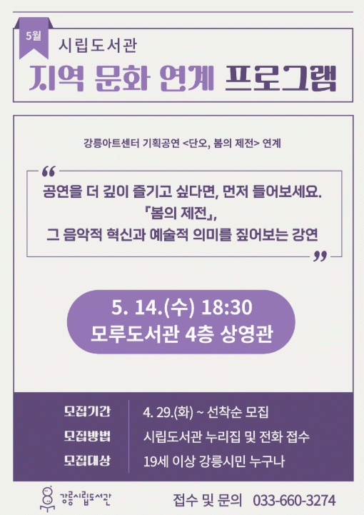 [»çȸ] °­¸ª½Ã ½Ã¸³µµ¼­°ü 5¿ù Áö¿ª ¹®È­ ¿¬°è ÇÁ·Î±×·¥ ¿î¿µ |2025. 04.29