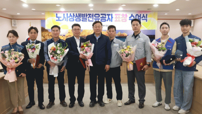 [NWS¹æ¼Û=Çѽ¸ñ ±âÀÚ]¿ï»ê µ¿±¸´Â 4¿ù 28ÀÏ ¿ÀÈÄ 4½Ã µ¿±¸Ã» 2Ãþ »óȲ½Ç¿¡ ³ë»ç »ó»ý ¹ßÀü À¯°øÀÚ 9¸í¿¡°Ô ǥâÀ» ¼ö¿©Çß´Ù. À̹ø ǥâÀº ±Ù·ÎÀÚÀÇ ³¯À» ¸Â¾Æ »ê¾÷ÇöÀå¿¡¼­ ¿­½ÉÈ÷ ÀÏÇÏ°í ³ë»ç È­ÇÕÀ» ÅëÇÑ ³ë»ç¹®È­ È®¸³¿¡ À̹ÙÁöÇÑ ºÐ¡¦