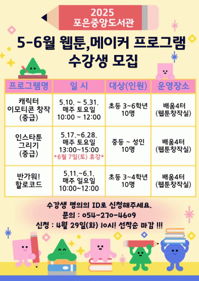 [NWS¹æ¼Û=Çѽ¸ñ ±âÀÚ]Æ÷Ç׽ø³Æ÷ÀºÁß¾Óµµ¼­°üÀº 5¿ùºÎÅÍ ½ÃÀ۵Ǵ ¿ÃÇØ 5~6¿ù À¥Å÷, ¸ÞÀÌÄ¿ ÇÁ·Î±×·¥ÀÇ ¼ö°­»ýÀ» 4¿ù 29ÀÏ 10½ÃºÎÅÍ ¼±Âø¼ø ¸ðÁýÇÑ´Ù. À¥Å÷¡¤¸ÞÀÌÄ¿ 3°³ÀÇ ÇÁ·Î±×·¥Àº ÃÊ¡¤Áߵ¼­ ÀϹݱîÁö ´Ù¾çÇÑ ¿¬·É´ë¸¦ ´ë»óÀ¸·Î ¡¦