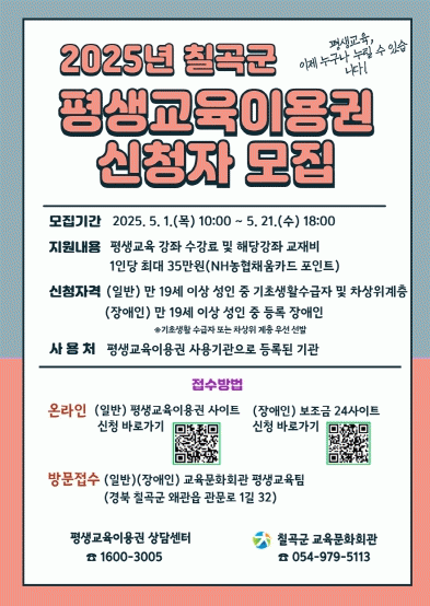 [NWS¹æ¼Û=Çѽ¸ñ ±âÀÚ]Ä¥°î±ºÀº Ãë¾à°èÃþÀÇ Æò»ýÇнÀ Âü¿© ±âȸ¸¦ È®´ëÇÏ°í »ý¾Ö Àç¼³°è¸¦ Áö¿øÇϱâ À§ÇØ 2025³â Æò»ý±³À°ÀÌ¿ë±Ç Áö¿ø »ç¾÷À» º»°Ý ÃßÁøÇÑ´Ù. ¿ÃÇØ´Â Àú¼ÒµæÃþ, µðÁöÅÐ Ãë¾à°èÃþ, ³ëÀÎ, Àå¾ÖÀÎ µî ÃÑ 221¸íÀ» ¼±Á¤ÇØ 1ÀΡ¦