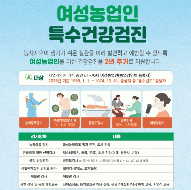 [NWS¹æ¼Û=Çѽ¸ñ ±âÀÚ]¿©¼ö½Ã´Â ¿©¼º³ó¾÷ÀÎÀÇ ³óÀÛ¾÷ Áúȯ ¿¹¹æ°ú °Ç°­º¹Áö ÁõÁøÀ» À§ÇØ 2025³âµµ ¿©¼º³ó¾÷ÀΠƯ¼ö°Ç°­°ËÁø »ç¾÷À» ½ÃÇàÇÑ´Ù°í ¹àÇû´Ù. ¿©¼º³ó¾÷ÀΠƯ¼ö°Ç°­°ËÁøÀº ¿©¼º³ó¾÷Àο¡°Ô ³ªÅ¸³¯ ¼ö ÀÖ´Â ±Ù°ñ°Ý°è, ½ÉÇ÷°ü°èÁúȯ¡¦