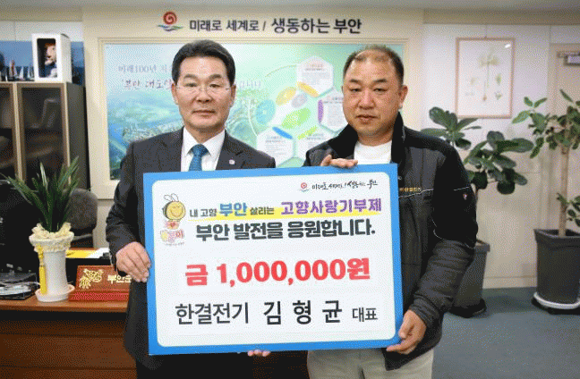 [NWS¹æ¼Û=Çѽ¸ñ ±âÀÚ]ºÎ¾È±º Çà¾È¸é¿¡¼­ ÇѰáÀü±â¸¦ ¿î¿µ ÁßÀÎ ±èÇü±Õ ´ëÇ¥°¡ Áö³­ 25ÀÏ, ºÎ¾È±º¿¡ °íÇâ»ç¶û±âºÎ±Ý 100¸¸ ¿øÀ» ±âŹÇß´Ù. ±èÇü±Õ ´ëÇ¥´Â ±×µ¿¾È ÀÌ¿ôµ½±â ¼º±Ý, Áö¿ª ÃʵîÇб³ ÀåÇбÝ, Ãë¾à°èÃþ ÈÄ¿ø µî ´Ù¾çÇÑ ÇüÅÂÀÇ¡¦