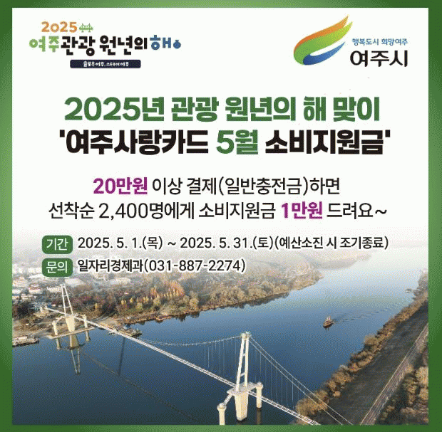 [»çȸ] ¿©ÁÖ½Ã, 2025³â 5¿ù ¿©ÁÖ °ü±¤ ¿ø³âÀÇ ÇØ ¼±Æ÷±â³ä '¿©ÁÖ»ç¶ûÄ«µå ¼ÒºñÁö¿ø±Ý' Áö¿ø |2025. 04.28