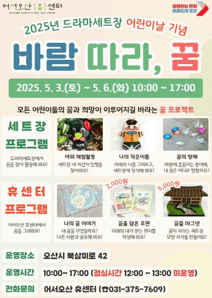 [NWS¹æ¼Û=Çѽ¸ñ ±âÀÚ]¿À»ê½Ã´Â 5¿ù 5ÀÏ ¾î¸°À̳¯À» ¸Â¾Æ ¡®¹Ù¶÷ µû¶ó, ²Þ¡¯ ÇÁ·Î±×·¥À» ¿î¿µÇÑ´Ù°í ¹àÇû´Ù. À̹ø ÇÁ·Î±×·¥Àº ¿À»ê µå¶ó¸¶¼¼Æ®Àå ÀÏ¿ø¿¡¼­ 5¿ù 3ÀϺÎÅÍ 6ÀϱîÁö 4Àϰ£ ÁøÇàµÈ´Ù. ¿î¿µ½Ã°£Àº ¿ÀÀü 10½ÃºÎÅÍ ¿ÀÈÄ 5½Ã±îÁö¸ç¡¦