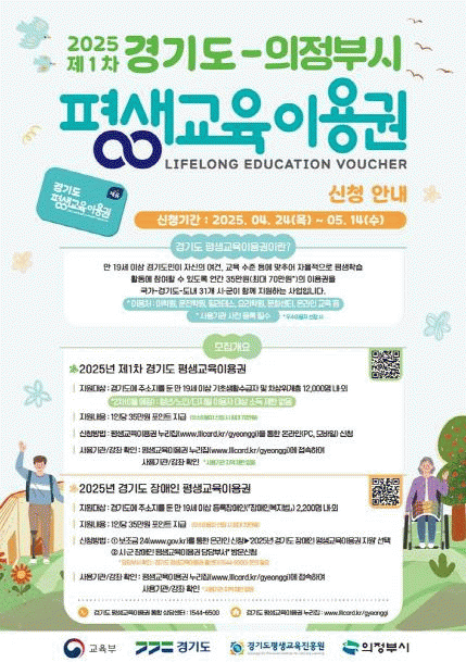 [NWS¹æ¼Û=Çѽ¸ñ ±âÀÚ]ÀÇÁ¤ºÎ½Ã´Â 5¿ù 14ÀϱîÁö ¡®2025³â Á¦1Â÷ °æ±âµµ Æò»ý±³À°ÀÌ¿ë±Ç Áö¿ø»ç¾÷¡¯ ½ÅûÀ» Á¢¼öÇÑ´Ù. Æò»ý±³À°ÀÌ¿ë±ÇÀº °æÁ¦Àû ¿©°Ç¿¡ µû¸¥ Æò»ý±³À° °ÝÂ÷¸¦ ¿ÏÈ­Çϱâ À§ÇØ °­Á ¼ö°­·á¸¦ Áö¿øÇÏ´Â Á¦µµ·Î, ¼±Á¤ÀÚ¿¡°Ô 1¡¦
