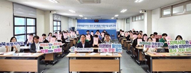 [NWS¹æ¼Û=Çѽ¸ñ ±âÀÚ]ÀüºÏƯº°ÀÚÄ¡µµÀÚ¿øºÀ»ç¼¾ÅÍ(ÀÌ»çÀå °í¿µÈ£)´Â Áö³­ 26ÀÏ ¡®Ã»³â °øÀÍȰµ¿ Áö¿ø»ç¾÷¡¯ ¼±Á¤ ´Üü ´ëÇ¥ ¹× ½Ç¹«ÀÚ 80¸íÀ» ´ë»óÀ¸·Î ȸ°è¡¤È«º¸ µî ½Ç¹«±³À°À» ½Ç½ÃÇß´Ù. À̹ø ±³À°Àº ¡®Ã»³â°øÀÍȰµ¿ Áö¿ø»ç¾÷¡¯ÀÇ ÀÏ¡¦