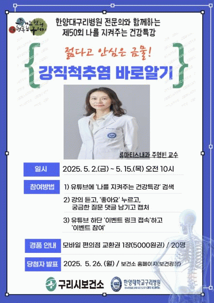 [NWS¹æ¼Û=Çѽ¸ñ ±âÀÚ]±¸¸®½Ã´Â ÇѾç´ë±¸¸®º´¿ø°ú Çù·ÂÇÏ¿© ¿À´Â 5¿ù 2ÀÏ, '³ª¸¦ ÁöÄÑÁÖ´Â °Ç°­Æ¯°­'À¸·Î ÁÖ¿µºó ·ù¸¶Æ¼½º³»°ú ±³¼öÀÇ ¡®Àþ´Ù°í ¾È½ÉÀº ±Ý¹°! °­Á÷ôÃß¿° ¹Ù·Î ¾Ë±â¡¯¸¦ ±¸¸®½Ã °ø½Ä À¯Æ©ºê ä³ÎÀÎ ±¸¸®ºñÀüÀ» ÅëÇØ ¼ÛÃâÇÑ¡¦