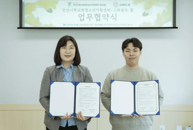 [NWS¹æ¼Û=Çѽ¸ñ ±âÀÚ]¾È»ê½Ã Çб³¹Ûû¼Ò³âÁö¿ø¼¾ÅÍ ¡®²Þµå¸²¡¯Àº Áö³­ 25ÀÏ Áö¿ª¹®È­¿¹¼ú´Üü ¡®±×¶ó¿îµå ¹´¡¯(´ëÇ¥ À¯Á¤Àç)°ú Çб³ ¹Û û¼Ò³âÀÇ °Ç°­ÇÑ ¼ºÀå°ú ÀÚ¸³À» Áö¿øÇϱâ À§ÇÑ ¾÷¹«Çù¾à(MOU)À» ü°áÇß´Ù°í 28ÀÏ ¹àÇû´Ù. À̹ø Çù¡¦