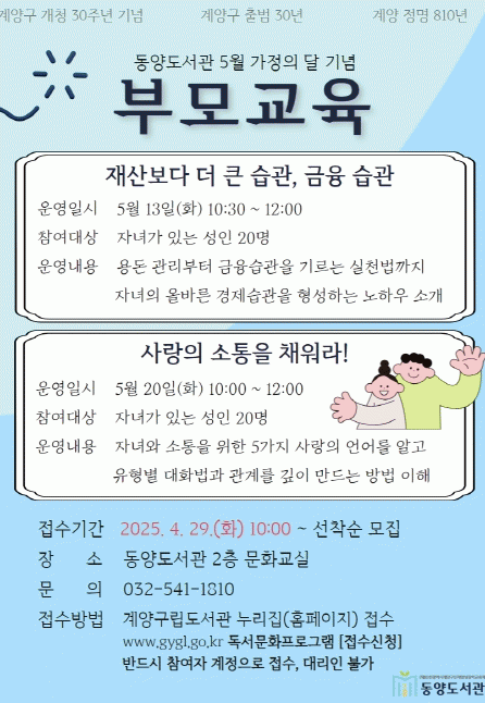 [»çȸ] °è¾ç±¸ µ¿¾çµµ¼­°ü, 5¿ù ºÎ¸ð±³À° Ư°­ Âü¿©ÀÚ ¸ðÁý |2025. 04.25