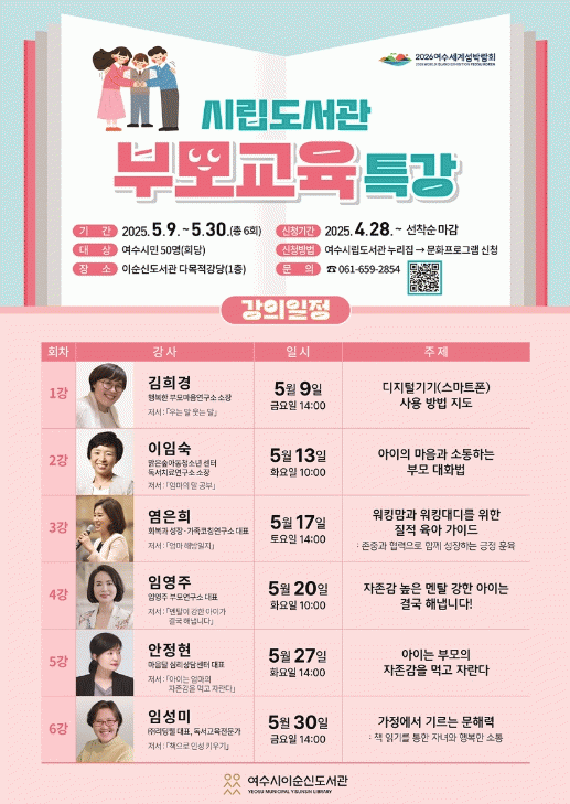 [NWS¹æ¼Û=Çѽ¸ñ ±âÀÚ]¿©¼ö½Ã¸³µµ¼­°üÀº °¡Á¤ÀÇ ´ÞÀ» ¸ÂÀÌÇÏ¿© ºÎ¸ð ¿ªÇÒÀÇ ÀÌÇØ¿Í ¿Ã¹Ù¸¥ ÀÚ³à ¾çÀ°¿¡ µµ¿òÀ» ÁÙ ¼ö ÀÖ´Â ºÎ¸ð±³À° Ư°­À» 5¿ù 9ÀϺÎÅÍ 5¿ù 30ÀϱîÁö ¿î¿µÇÑ´Ù. À̹ø Ư°­Àº ÀÚ³à ¾çÀ° Àú¼­¸¦ ÁýÇÊÇϰí, ºÎ¸ð±³À° °­ÀÇ¡¦
