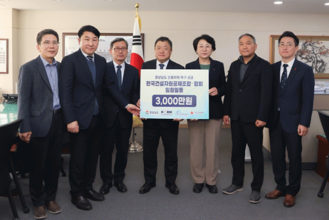[NWS¹æ¼Û=Çѽ¸ñ ±âÀÚ]°æ»ó³²µµ´Â 24ÀÏ ¿ÀÈÄ 2½Ã 30ºÐ °æ³²µµÃ»¿¡¼­ Çѱ¹°Ç¼³ÀÚ¿ø°øÁ¦Á¶ÇÕÀÌ °æ³²Áö¿ª »êºÒ ÇÇÇØ ÁֹεéÀ» µ½±â À§ÇØ 3,000¸¸ ¿øÀÇ ¼º±ÝÀ» ±âŹÇß´Ù°í ¹àÇû´Ù. ±è±ÝÁÖ Çѱ¹°Ç¼³ÀÚ¿ø°øÁ¦Á¶ÇÕ ÀÌ»çÀå°ú ÀÌÇÊ±Ô ºÎ¿ï°æÁöºÎ ¡¦