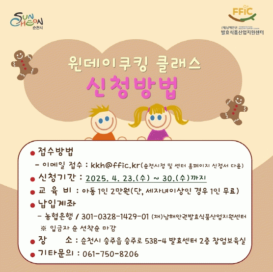 [»çȸ] ¼øÃµ½Ã (Àç)³²ÇؾȱǹßÈ¿½Äǰ»ê¾÷Áö¿ø¼¾ÅÍ, ¾ÆÀ̶û ÇÔ²²ÇÏ´Â ¹ßÈ¿ ÄíŷŬ·¡½º Âü°¡ÀÚ ¸ðÁý |2025. 04.24