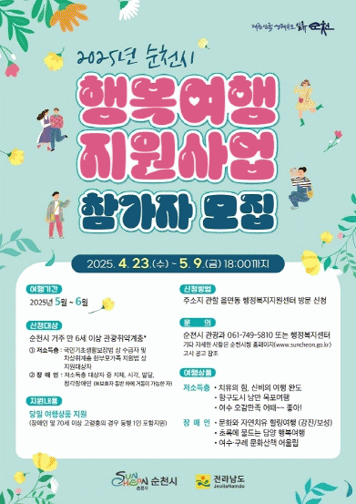[»çȸ] ¼øÃµ½Ã, Ãë¾à°èÃþ ´ë»ó ¡®Çູ¿©Çà Áö¿ø»ç¾÷¡¯ Âü°¡ÀÚ ¸ðÁý |2025. 04.24