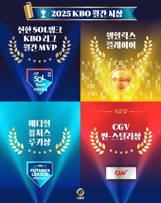 [NWS¹æ¼Û=¼­Çö¼® ±âÀÚ]2025 ½ÅÇÑ SOL¹ðÅ© KBO ¸®±×ÀÇ ¿­±â¸¦ ´õÇÒ ¿ù°£ ½Ã»óÀÌ 4°³ ºÎ¹®¿¡¼­ ÆîÃÄÁø´Ù. ¡®2025 ½ÅÇÑ SOL¹ðÅ© KBO ¸®±× ¿ù°£ MVP¡¯´Â KBO¿Í KBO ¸®±× ŸÀÌÆ²½ºÆù¼­ÀÎ ½ÅÇÑÀºÇàÀÌ ÇÔ²² ÁÖ°üÇØ ¸Å¿ù ¼±Á¤ÇÑ´Ù. ¸Å´Þ KBO ¸®±×¡¦