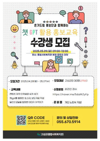 [NWS¹æ¼Û=Çѽ¸ñ ±âÀÚ]°í¼º±ºÀÌ ¿î¿µÇÏ´Â °í¼º±ºÁ¾ÇÕ»çȸº¹Áö°ü¿¡¼­´Â ¿Â±âµå¸² È«º¸´Ü ÇÔ²²ÇÏ´Â Áֹα³À°'êgpt¸¦ Ȱ¿ëÇÑ È«º¸±³À°'¼ö°­»ýÀ» ¸ðÁýÇÑ´Ù. À̹ø ±³À°Àº ¿À´Â 5¿ù 9ÀÏ 9½ÃºÎÅÍ 12½Ã±îÁö °í¼º±ºÁ¾ÇÕ»çȸº¹Áö°ü ºÐ°ü(°ø°ø½Ç¹ö¡¦