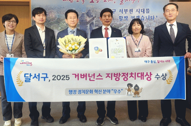 [NWS¹æ¼Û=Çѽ¸ñ ±âÀÚ]´ë±¸ ´Þ¼­±¸´Â (»ç)°Å¹ö³Í½º¼¾ÅͰ¡ ÁÖÃÖÇϰí Áö¹æ½Ã´ëÀ§¿øÈ¸¿Í Àü±¹½ÃÀ塤±º¼ö¡¤±¸Ã»ÀåÇùÀÇȸ°¡ ÈÄ¿øÇÏ´Â ¡º2025 °Å¹ö³Í½º Áö¹æÁ¤Ä¡´ë»ó¡»¿¡¼­ ÇàÁ¤¡¤Á¤Ä¡¹®È­ Çõ½Å ºÎ¹® ¿ì¼ö»óÀ» ¼ö»óÇß´Ù. ¡º°Å¹ö³Í½º Áö¹æÁ¤Ä¡´ë¡¦