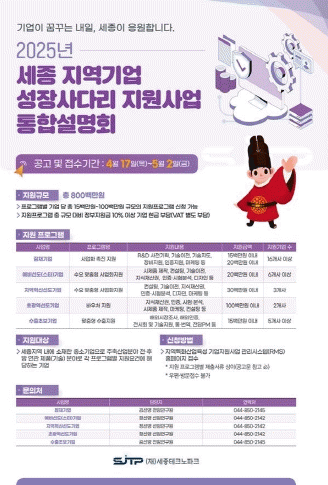 [°æÁ¦] ¼¼Á¾Å×Å©³ëÆÄÅ©,'2025³â ¼¼Á¾Áö¿ª±â¾÷ ¼ºÀå »ç´Ù¸®Áö¿ø»ç¾÷'Áö¿ø±â¾÷ ¸ðÁý |2025. 04.24