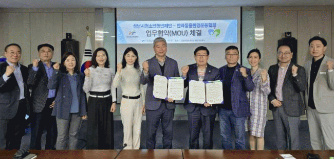 [NWS¹æ¼Û=Çѽ¸ñ ±âÀÚ]¼º³²½Ãû¼Ò³âû³âÀç´ÜÀº 4¿ù 23ÀÏ, ¹Ý·Áµ¿¹°È¯°æ¿îµ¿Çùȸ¿Í û¼Ò³âÀÇ ¿Ã¹Ù¸¥ ¹Ý·Áµ¿¹° ¹®È­ Á¶¼º°ú »ý¸íÁ¸Áß °¡Ä¡ È®»êÀ» À§ÇÑ ¾÷¹«Çù¾àÀ» ü°áÇß´Ù. À̹ø Çù¾àÀº ¹Ý·ÁÀα¸ Áõ°¡¿Í »çȸÀû ÀÎ½Ä º¯È­¿¡ ´ëÀÀÇØ, û¼Ò¡¦