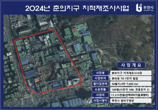 [NWS¹æ¼Û=Çѽ¸ñ ±âÀÚ]ºÎõ½Ã´Â Áö³­ 23ÀÏ ÃáÀÇÁö±¸¿Í ¿Á±æ2Áö±¸, ³»µ¿Áö±¸ µî 3°³ Áö±¸¿¡ ´ëÇÑ ÁöÀûÀçÁ¶»ç»ç¾÷À» ¿Ï·áÇϰí, »õ·Î¿î ÅäÁö °æ°è¸¦ È®Á¤Çß´Ù°í 24ÀÏ ¹àÇû´Ù. ÁöÀûÀçÁ¶»ç»ç¾÷Àº ÅäÁöÀÇ ½ÇÁ¦ ÀÌ¿ë ÇöȲ°ú ÀÏÄ¡ÇÏÁö ¾Ê´Â ÁöÀû¡¦