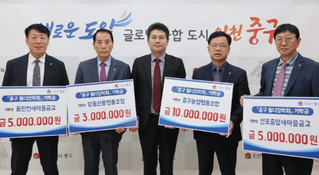 [NWS¹æ¼Û=ÇãÀº¼­ ±âÀÚ] ÀÎõ Áß±¸ ¿ùµðÀåÇÐȸ´Â Áö¿ª ±ÝÀ¶±â°ü 4°÷À¸·ÎºÎÅÍ ÃÑ 2,300¸¸ ¿øÀÇ ÀåÇбÝÀ» ±âŹ¹Þ¾Ò´Ù°í 24ÀÏ ¹àÇû´Ù. À̹ø¿¡ ÀåÇÐ±Ý ±âŹÀ» ÇÑ ±ÝÀ¶±â°üÀº Áß±¸³ó¾÷Çùµ¿Á¶ÇÕ, ½ÅÆ÷Áß¾Ó»õ¸¶À»±Ý°í, µ¿ÀÎõ»õ¸¶À»±Ý°í, ´äµ¿½Å¡¦