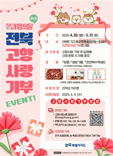 [NWS¹æ¼Û=Çѽ¸ñ ±âÀÚ]ÀüºÏƯº°ÀÚÄ¡µµ´Â 5¿ù °¡Á¤ÀÇ ´ÞÀ» ¸Â¾Æ °íÇâ¿¡ ´ëÇÑ °ü½É°ú ¾ÖÁ¤À» Ç¥ÇöÇÒ ¼ö ÀÖ´Â ¡®ÀüºÏ °íÇâ»ç¶û ±âºÎ À̺¥Æ®¡¯¸¦ ¿À´Â 4¿ù 28ÀϺÎÅÍ 5¿ù 31ÀϱîÁö ÇÑ ´Þ°£ ÁøÇàÇÑ´Ù°í ¹àÇû´Ù. À̹ø À̺¥Æ®´Â °íÇâ»ç¶û±âºÎÁ¦¿¡¡¦
