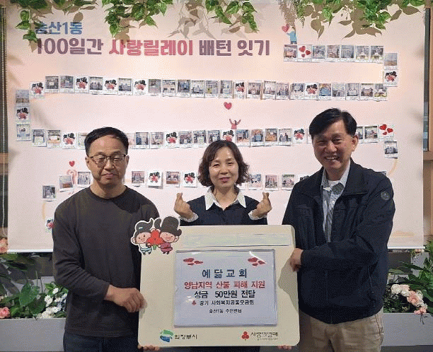 [NWS¹æ¼Û=Çѽ¸ñ ±âÀÚ]ÀÇÁ¤ºÎ½Ã ¼Û»ê1µ¿Áֹμ¾ÅÍ´Â 4¿ù 22ÀÏ ¿ëÇöµ¿ ¼ÒÀç ¿¹´à±³È¸°¡ ¿µ³²Áö¿ª »êºÒÇÇÇØ Áö¿øÀ» À§ÇØ ¼º±Ý 50¸¸ ¿øÀ» Àü´ÞÇß´Ù°í ¹àÇû´Ù. À̹ø ¼º±ÝÀº ÀÌÀç¹ÎÀÇ °íÅëÀ» ÇÔ²² ³ª´©°í ºü¸¥ ÀÏ»óȸº¹À» ¿°¿øÇÏ´Â ¸¶À½À» ´ã¾Æ¡¦