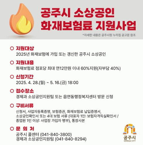 [°æÁ¦] °øÁÖ½Ã, ¡®¼Ò»ó°øÀÎ È­À纸Çè·á¡¯ ÃÖ´ë 12¸¸¿ø Áö¿ø |2025. 04.24