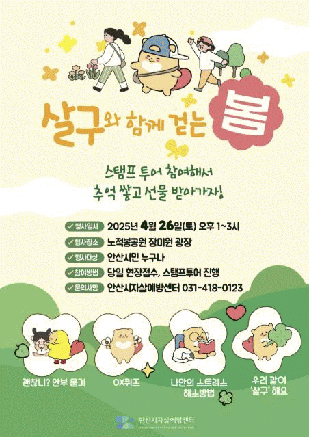 [»çȸ] ¾È»ê½ÃÀڻ쿹¹æ¼¾ÅÍ, 26ÀÏ ³ëÀûºÀ°ø¿ø¼­ '»ì±¸¿Í ÇÔ²² °È´Â º½' °³ÃÖ |2025. 04.24