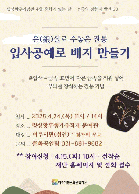 [»çȸ] ¿©ÁÖ¼¼Á¾¹®È­°ü±¤Àç´Ü, 2025³â 4¿ù ¸í¼ºÈ²Èıâ³ä°ü ¹®È­°¡ ÀÖ´Â ³¯ 'Àº(ëÞ)½Ç·Î ¼ö³õÀº ÀüÅë, ÀÔ»ç°ø¿¹·Î ¹èÁö ¸¸µé±â' ÁøÇà |2025. 04.24