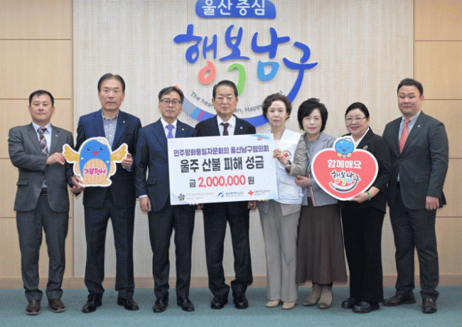 [NWS¹æ¼Û=Çѽ¸ñ ±âÀÚ] ¹ÎÁÖÆòÈ­ÅëÀÏÀÚ¹®È¸ÀÇ ¿ï»ê³²±¸ÇùÀÇȸ(ȸÀå Àå¼öö)Àº 23ÀÏ ³²±¸Ã»À» ¹æ¹®ÇØ ¿ïÁÖ±º »êºÒÇÇÇØ º¹±¸¸¦ À§ÇÑ ¼º±Ý 200¸¸ ¿øÀ» Àü´ÞÇß´Ù. À̹ø ¼º±ÝÀº ÃÖ±Ù ¹ß»ýÇÑ ¿ïÁÖ±º »êºÒ·Î ÇÇÇØ¸¦ ÀÔÀº ÀÌ¿ôµéÀÇ Á¶¼ÓÇÑ ÀÏ»ó¡¦